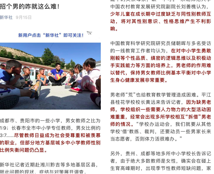 新华社发过公号文《招个男的咋就这么难!》,因为教师职业女多男少,很多学校都在降分录取男老师。