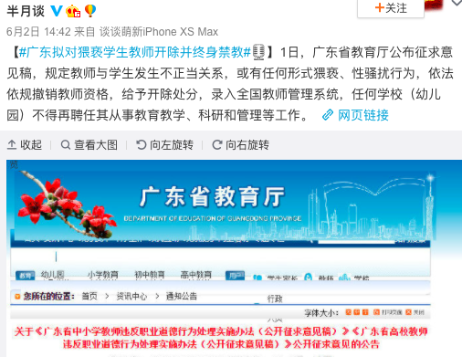 今年6月,广东教育厅征求意见,规定教师与学生发生不正当关系,或有任何形式猥亵、性骚扰行为者,会撤销教师资格,不得从事教育科研等工作。