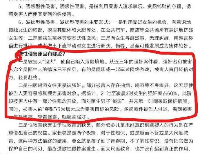 而辽宁师范大学出版的大学生安全教育也如出一辙:“喜欢网聊、衣着暴露、喜欢和男人暧昧、抽烟喝酒、占小便宜、想要获得成功、过度迷信崇拜对方的女性,容易被性侵。”