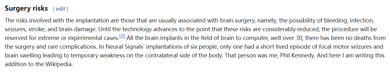 菲利普·肯尼迪发明了神经营养电极,1996 年由 Roy Bakay 首次植入患者体内,显示出一些改善,但在随后的几次人体实验中表现出风险。肯尼迪决定在自己身上进行实验,在取得进展的同时给自己造成了一些伤害。他自己在英文版维基百科的神经营养电极条目中谈论它的副作用。