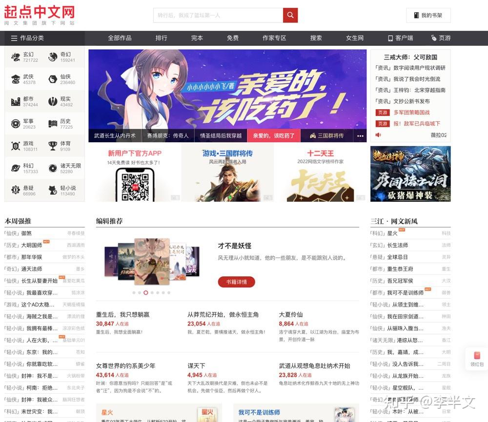 首先是起点中文网,创建于2002年5月,是国内最大文学阅读与写作平台之一,同时是国内领先的原创文学门户网站,隶属于数字内容综合平台——阅文集团旗下。