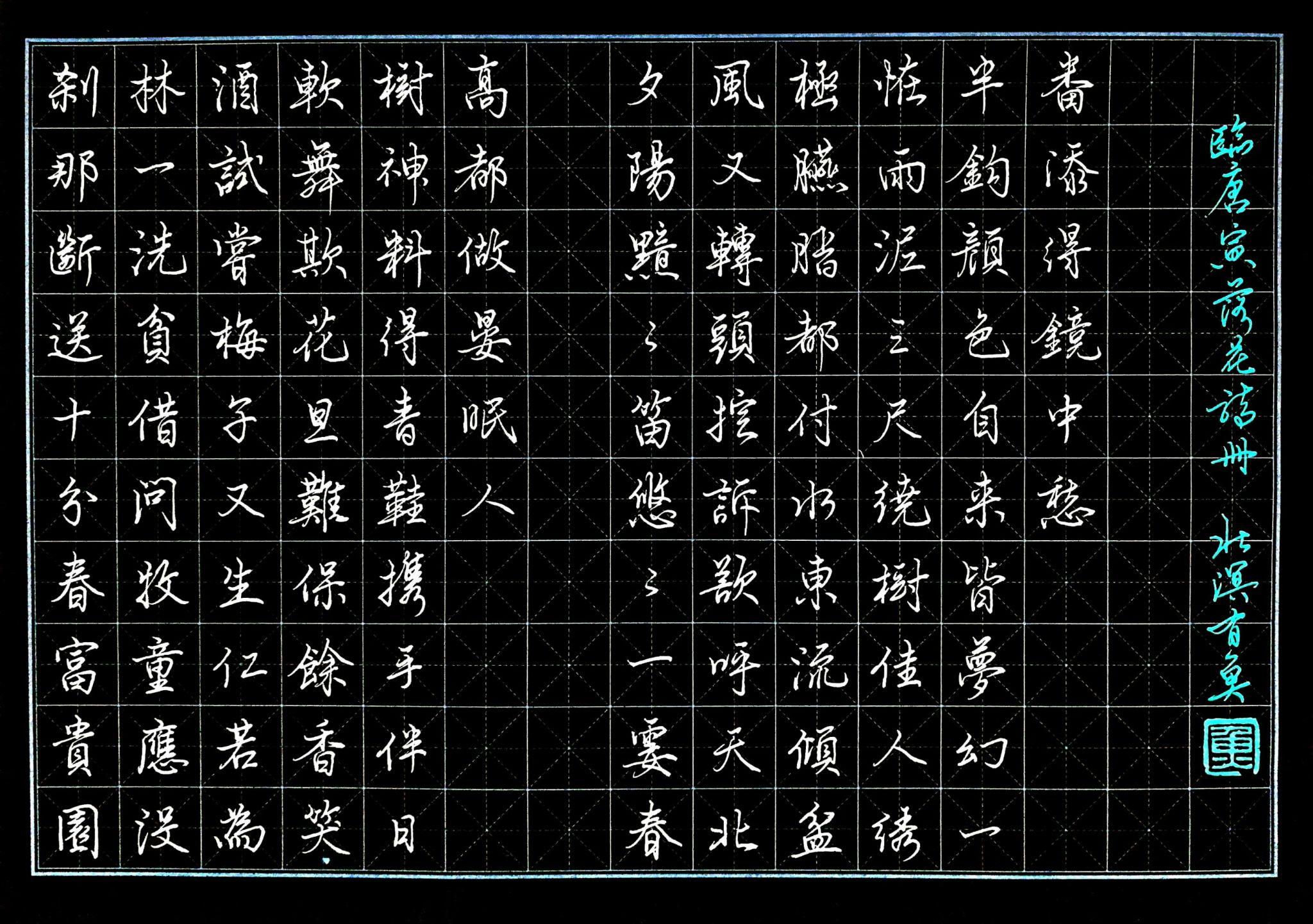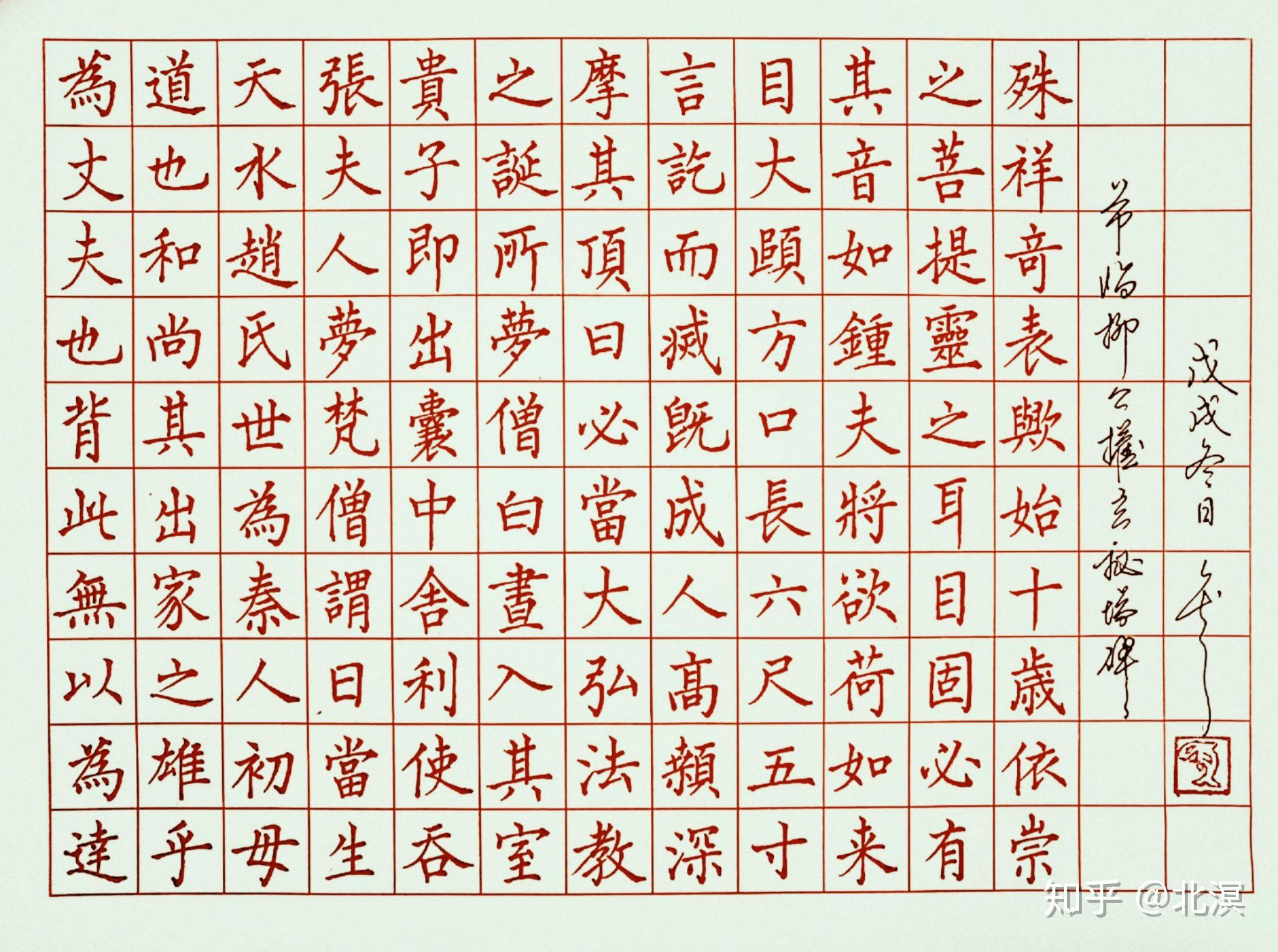 字帖一般是用田字格作为标准的,所以同样用田字格,容易比对笔画位置和结构的准确性。练习一阵后可尝试方格,但不要轻易写横行,竖行。轻易放飞自我的代价是好容易建立起的习惯扔掉,回到起点。