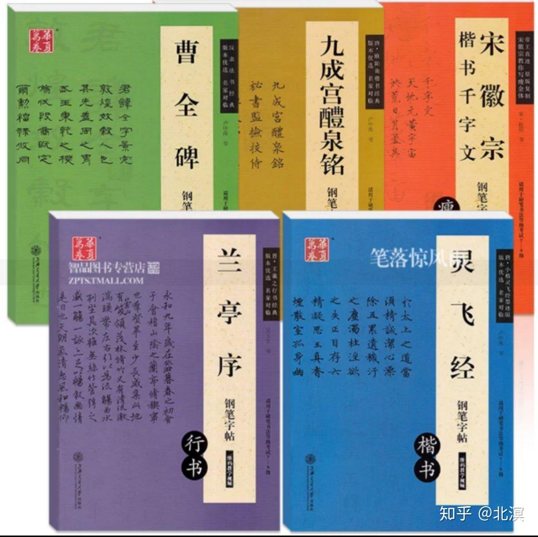 (2)如果有一定临帖基础,希望更进一步。我推荐下面这套,都是当代硬笔名家临习的著名古帖,包括兰亭序、九成宫、灵飞经、曹全碑和千字文。临写难度比直接临习古帖要低,更容易上手。