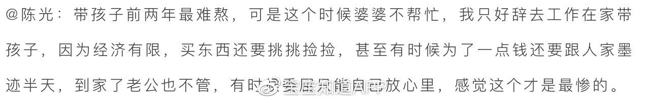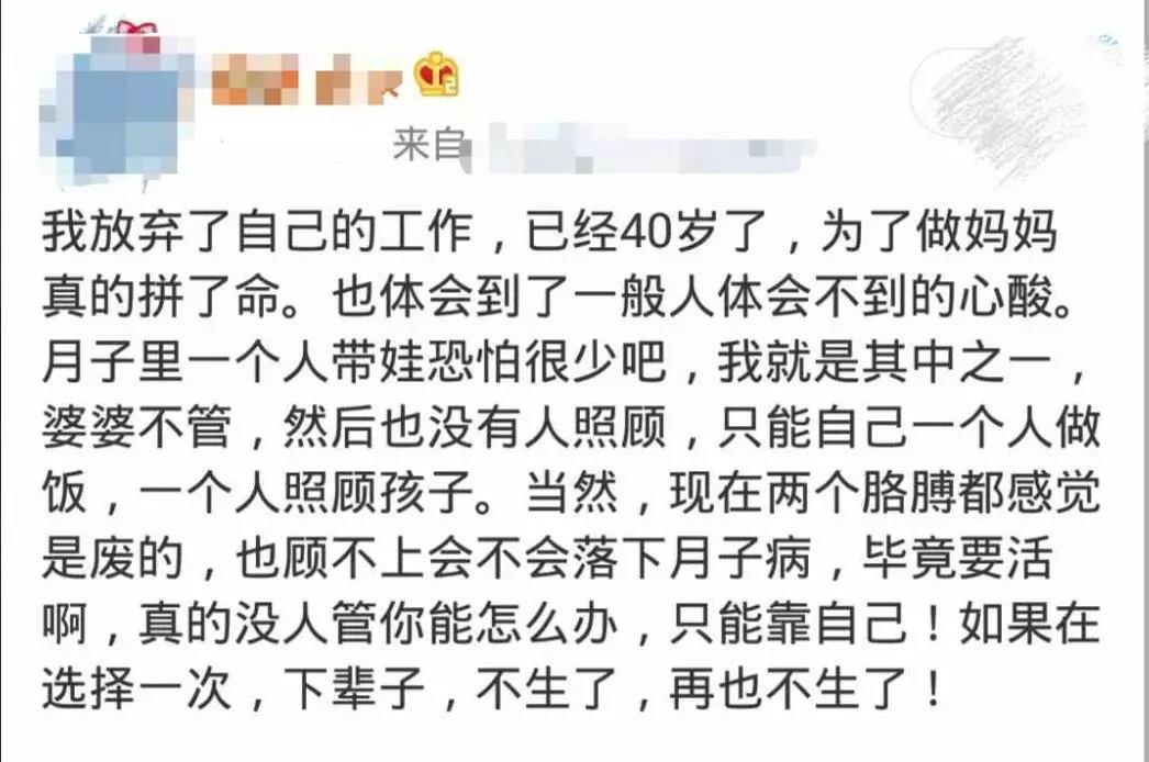 评论里,有人表示感同身受,说自己40岁放弃了所有,生了孩子,一个人在家里带孩子,常常崩溃,如果有下辈子,自己再也不生了!