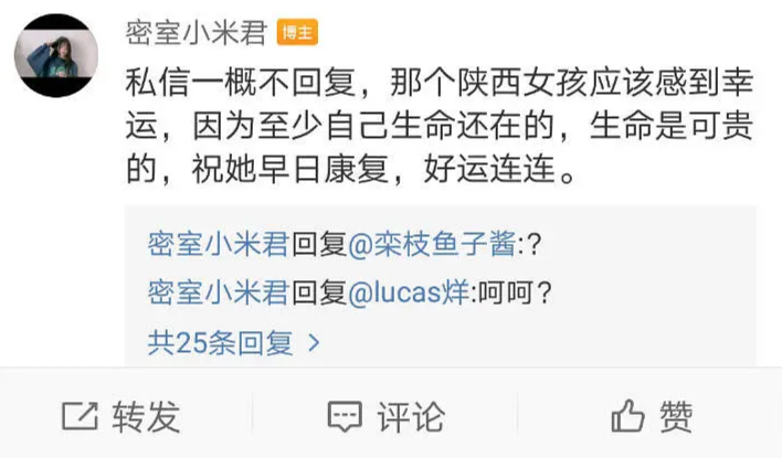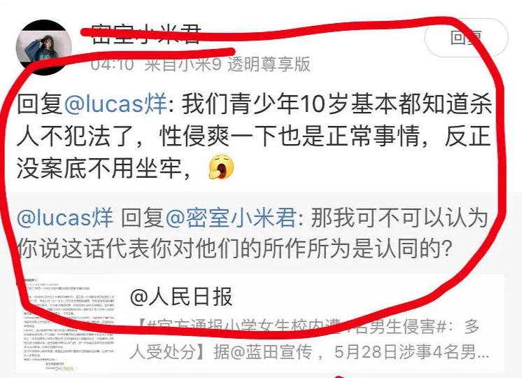 上海这个事件发生后,有个网友@密室小米君,也在赤裸裸挑衅我们的认知:性侵爽一下也是正常,反正没案底不...那个陕西女孩应该感到幸运,起码她的命还在……