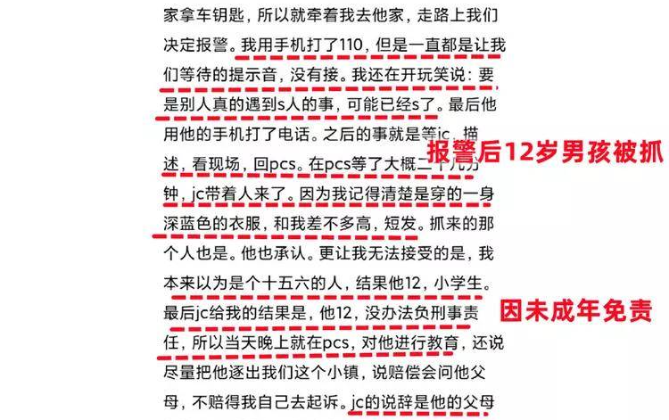 8月7号,自己在下班途中被一个男孩企图侵犯,报警后却得知对方只是一个12岁的小学生。