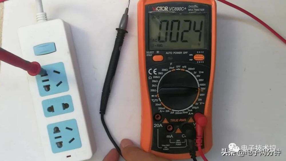 上面工作都准备好就可以去区分零线和地线了(注意这里没有火线),用红表笔去插向待区分的两个插孔或者去接触待区分的两根导线,在测量的过程中同样会观察到这两根线在测量时显示屏上显示的电压值不同,不过这个数值比连在火线上时要小的多,这也是选择小量程的原因。
