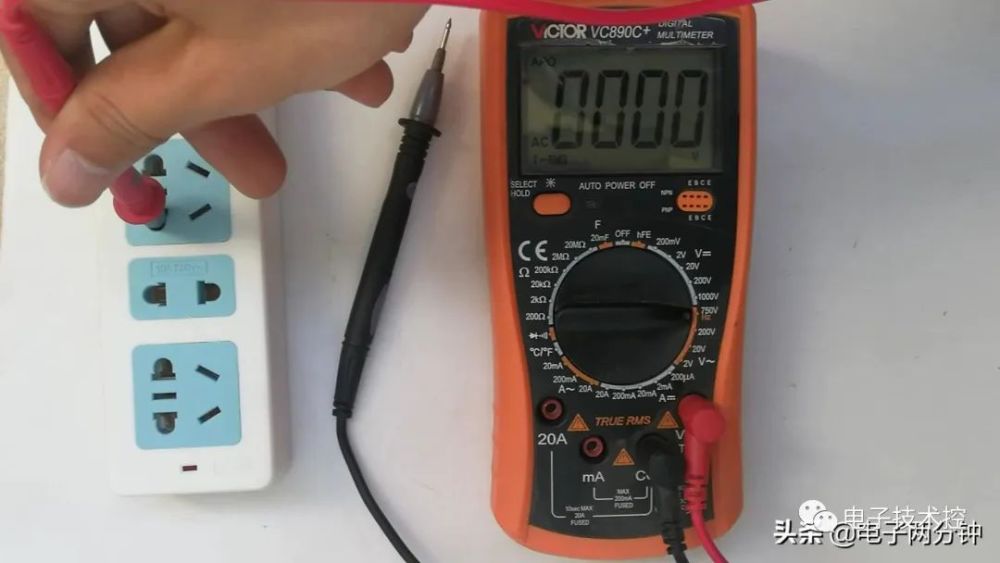 为了安全起见,防止选错档位而发生触电事故,可以把黑表笔放在一个绝缘的地方,尽量不要用手去触摸黑表笔(虽说只要正确操作,去触摸黑表笔是没事的,但是为了安全起见,最好别去摸),用红表笔插向待区分的两个插孔(线)。