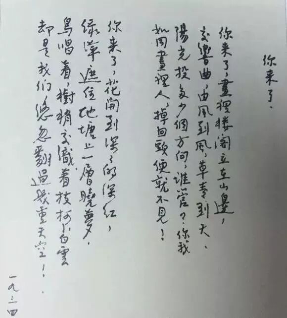 林徽因的诗歌《你来了》手稿母亲写作新诗,开始时在一定程度上,受到过徐志摩的影响和启蒙。她同徐志摩的交往,是过去文坛上许多人都知道,却又讹传很多的一段旧事。在我和姐姐长大后,母亲曾经断断续续地同我们讲过他们的往事。母亲同徐是 1920 年在伦敦结识的。当时徐是外祖父的年轻朋友,一位 24 岁的已婚者,在美国学过两年经济之后,转到剑桥学文学,而母亲则是一个还未脱离旧式大家庭的 16 岁的女中学生。