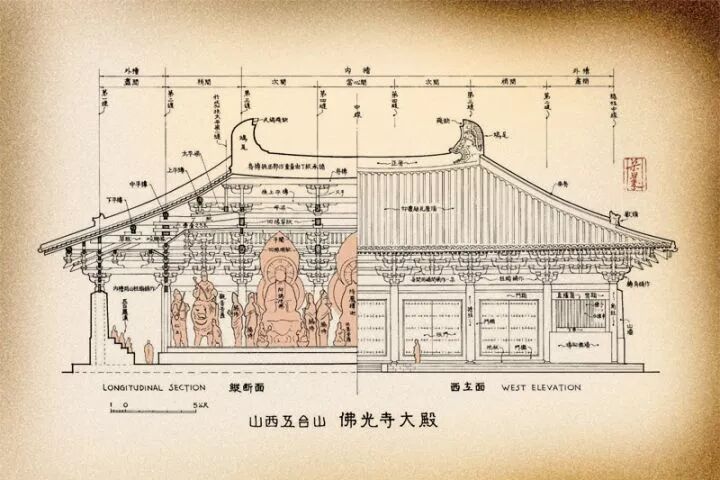 这一发现在中国建筑史,和他们个人的学术生活中的意义,当然是非同小可的。直到许多年以后,母亲还常向我们谈起当时他们的兴奋心情。讲他们怎样攀上大殿的天花板,在无数蝙蝠扇起的千年尘埃,和无孔不入的臭虫堆中摸索着测量,母亲又怎样凭她的一双远视眼,突然发现了大梁下面一行隐隐约约的字迹,就是这些字,成了建筑年代的确凿证据。佛光寺手稿而对谦逊地隐在大殿角落中,本庙施主「女弟子宁公遇」端庄美丽的塑像,母亲更怀有一种近乎崇敬的感情。她曾说,当时恨不能也为自己塑一尊像,让「女弟子林徽因」、水远陪伴这位虔诚的唐朝妇女,在肃穆中再盘腿坐上他一千年!可惜这竟是他们战前事业的最后一个高潮。