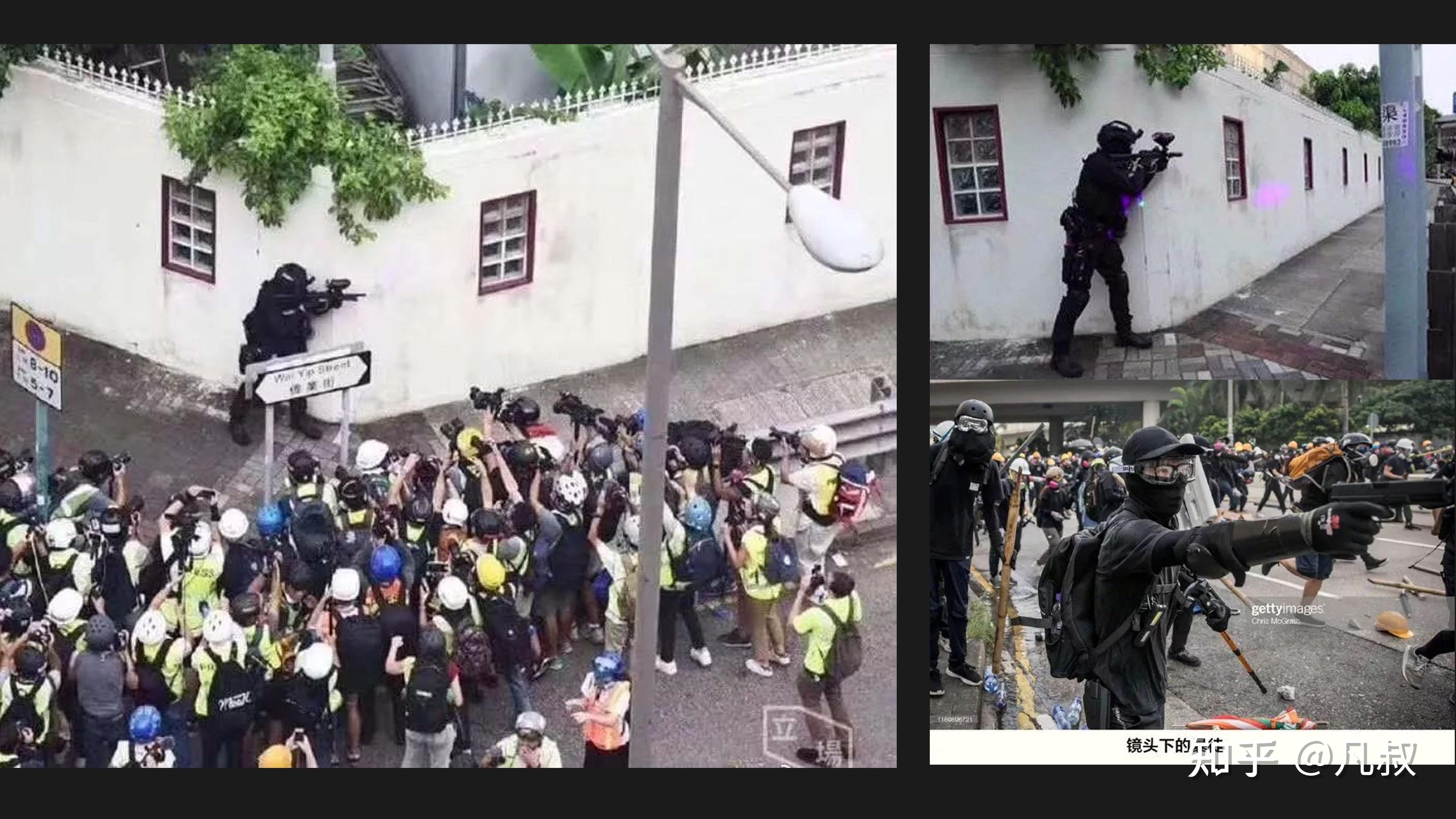 左为现场情况,大部分记者将镜头对准执行任务的香港警察