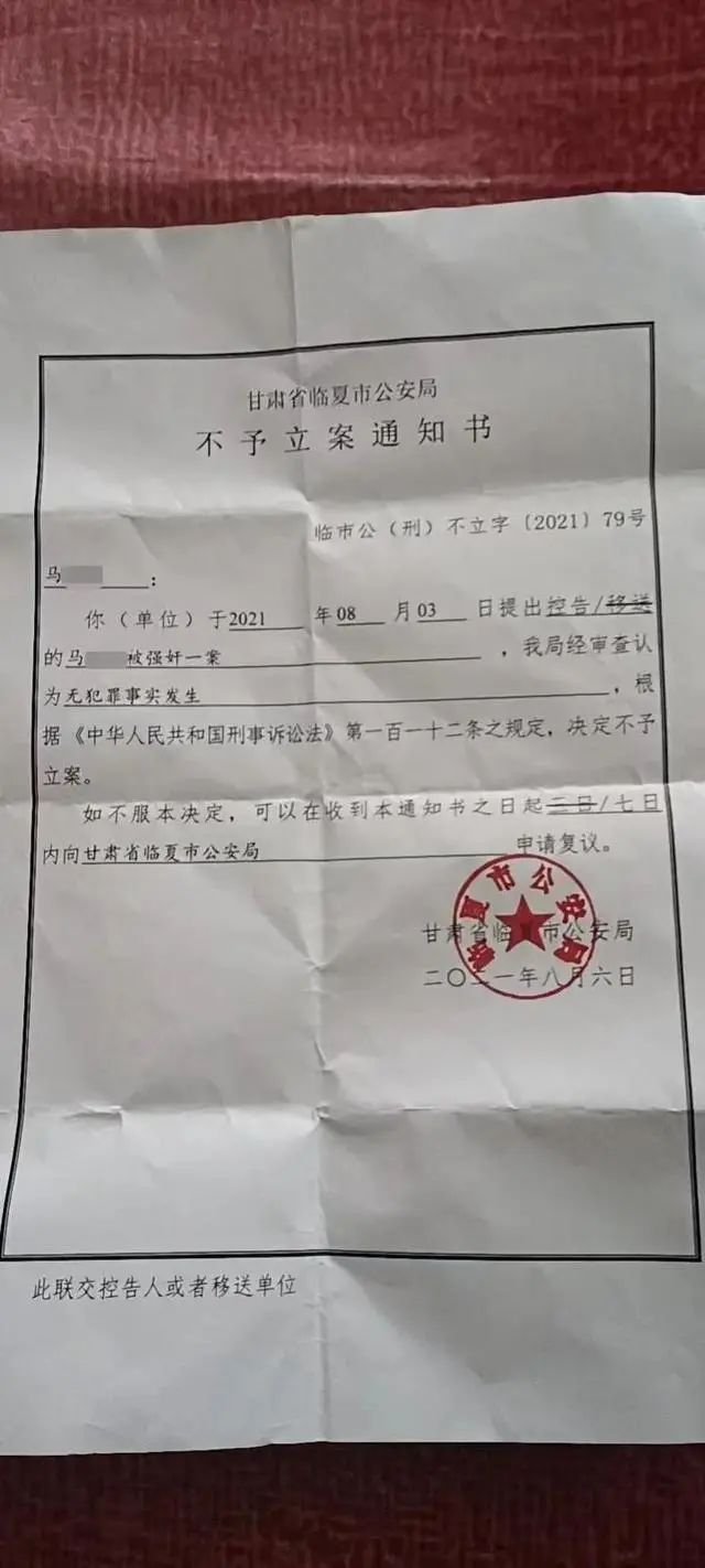 2021年9月3日,临夏市公安局作出《刑事复议决定书》称,经审查,认为此前该局作出的《不予立案决定书》认定的事实清楚、证据充分、依据准确、程序合法,决定维持原决定。