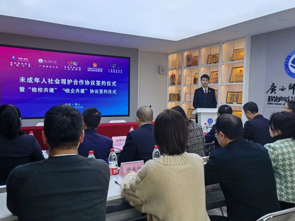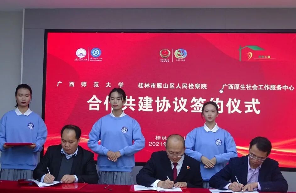 2021年12月23日,桂林市雁山区人民检察院邀请广西师范大学政治与公共管理学院、广西师范大学大学生心理健康教育中心、中国共产主义青年团桂林市雁山区委员会、桂林福桂纸业有限公司、广西厚生社会工作服务中心在广西师范大学举办了“未成年人社会观护合作协议”签约仪式暨“检校共建”、“检企共建”合作签约仪式。
