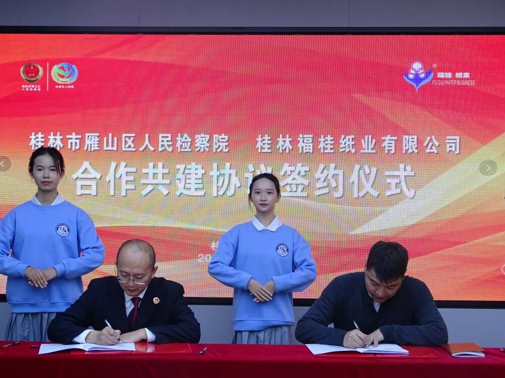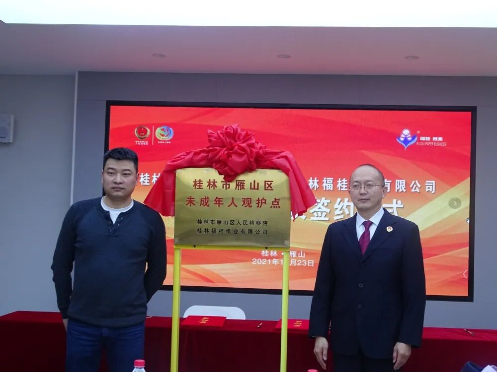 随后进行桂林市雁山区人民检察院与桂林福桂纸业有限公司《检企共检协议》的签约仪式,以及“桂林市雁山区未成年人观护点”揭牌仪式。桂林福桂纸业有限公司总经理银泽国上台致辞。