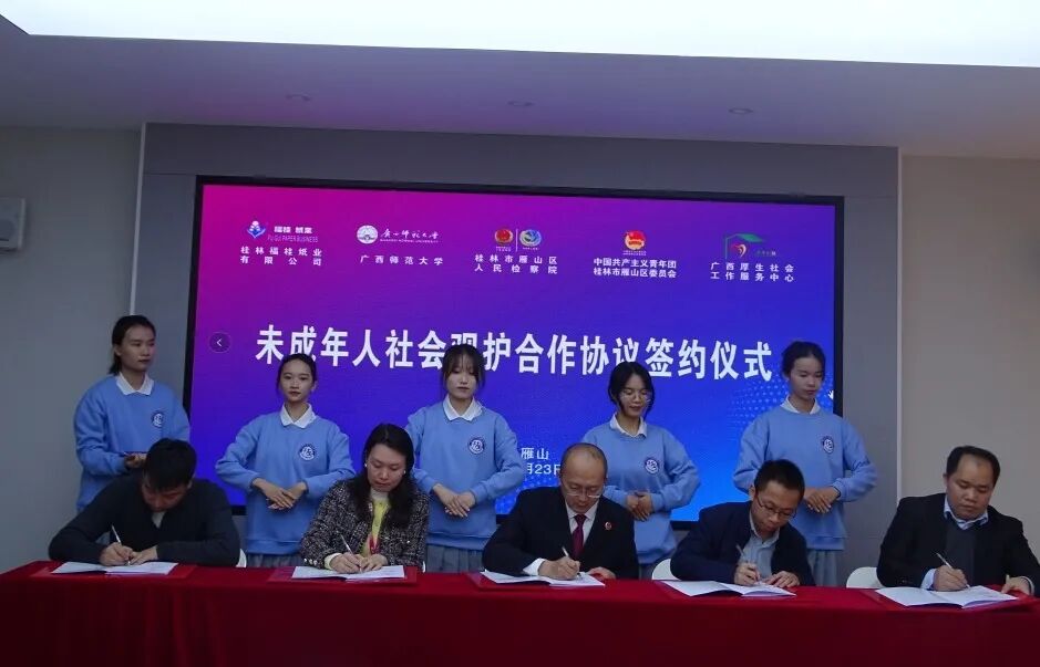 桂林市雁山区人民检察院、广西师范大学、中国共产主义青年团桂林市雁山区委员会、桂林福桂纸业有限公司、广西厚生社会工作服务中心签署的《未成年人社会观护合作协议》,旨在深入贯彻落实《中华人民共和国未成年人保护法》《中华人民共和国预防未成年人犯罪法》,建设“检、校、团、企、社”五位一体的未成年人观护帮教新模式。