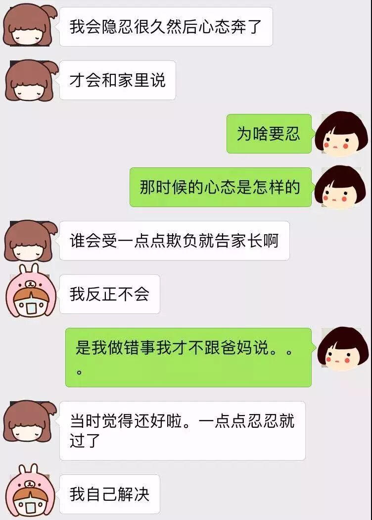 匿名1:在大半年前,刚上高一,因为一些无谓的流言蜚语,被冷眼孤立被传谣被指指点点过,经常需要准备纸巾因为桌子上总会有胶水,椅子上也总会有钉子。记得最难过的一次是一个同学当着全班的面把我的课本撕烂了,然后跟我说,喔不好意思不小心撕烂了,要不你把它捡起来粘上吧?说实话那时候过得很糟糕,每天都恨不得请假回家。我也曾因为受不了,伤害过自己,很长一段时间不敢和人说话不敢抬头看对方的眼睛…