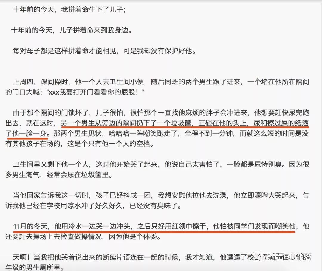 她的儿子才读小学四年级,在男生厕所里,被尿和擦过屎的纸洒了他的脸一身。孩子因此患上重度抑郁。