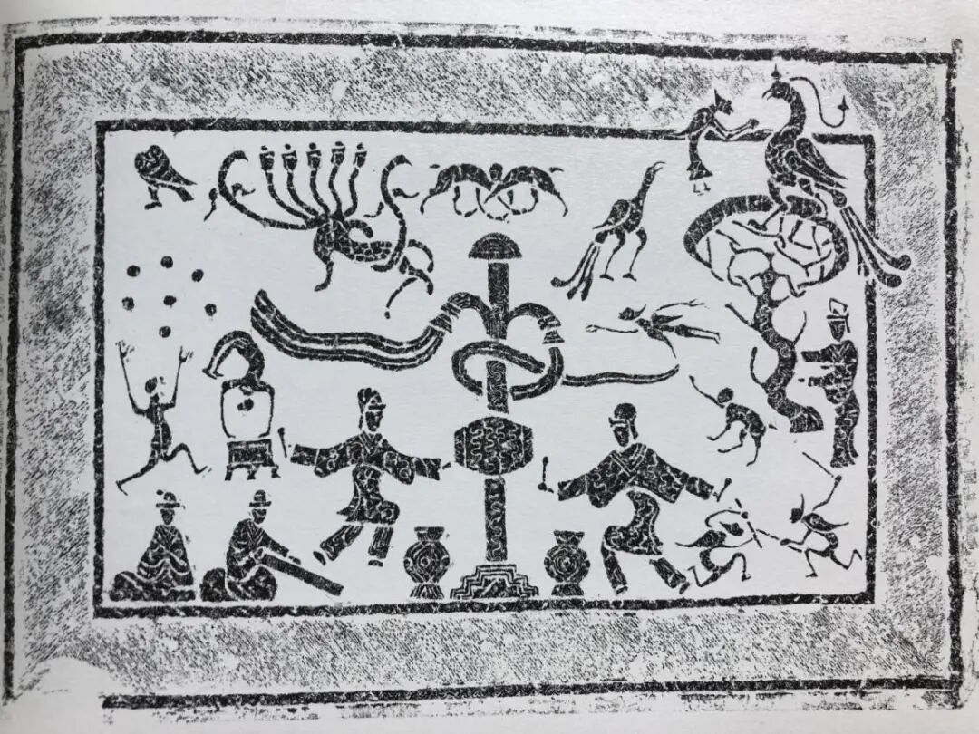 所以命名《建鼓乐舞》,是因为视觉直观的建鼓舞居于画像中央,占据了主要画面:通天达地的建木将画面左右平分,华盖之下飞舞飘动的羽葆又将画面上下平分,恰成“四格画”。建木之下,两侧各有一戴冠男子执桴弓步横向击鼓;建鼓底座旁又各有一跗鼓(亦或为酒壶),供鼓舞者上下击打。画面左侧下格,是人界乐舞百戏,端坐的吹箫抚琴的乐伎上方,是掷丸和叠案倒立的男女俳优表演,倒立者双腿左甩,与羽葆连成一体,掷丸者抛向空中的七丸(北斗之数)飞上了左侧上格。左上格自左向右是祥禽鸱鸮和七头(五人头,二鸟头)瑞兽,一头二身的神猴(侯),各以一身置于左右侧,以前肢相交于华盖之上的中点,恰是猴头所在。在这一表演场中,猴有3、建鼓舞者有2、俳优有2、乐伎有2、凤鸟有2、鸱鸮有1、七头瑞兽有1、人有1、羽人有4,可见羽人话语权力不小。