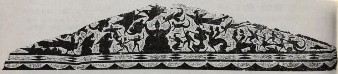 人界的第二格再现了“周公辅成王”的历史典故:周公为周武王之弟,武王死后,周公一心辅佐年幼的武王之子周成王,即使遭遇奸臣的谗言仍忠心耿耿,巩固朝政。画像中,位于中心位置且身材矮小者即为年幼的周成王,其右为跽跪的周成王及大臣,尽显其忠;其右为持华盖等侍奉的侍者。该图为肯定性的社会伦理判断,故在上。人界的第三格亦为历史典故——“骊姬害太子申生”:春秋时期,骊姬作为晋献公的宠妃野心勃勃,为使自己亲生骨肉继承王位,设计害死了晋太子申生。画面中间跪地者为晋太子申生,手持一匕首朝向自己,右侧一只躺地观望的狗,暗示了右边奸臣计谋得逞。该图为否定性的社会伦理判断,故在下。人界的第四格是降到了地面的车马图,车马自东向西行进,最左侧一人一狗在路边恭候贵客的到来,其隐喻类同于图16 同样于左下角跽跪的鸱鸮。显而易见,世人若登仙界,必须除恶(“骊姬害晋太子申生”)扬善(“周公辅成王”),需要在现实社会中做到忠、孝、仁、义,如此方能跟随羽人见到西王母,得到仙草,长生不老。这几乎是一种潜在的汉代意识形态。