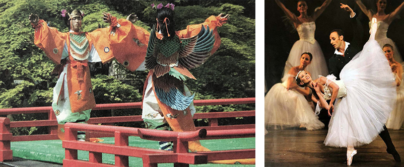 1907 年,英国考古学家斯坦因在中国楼兰的遗址中发现六件“有翼天使”像(见图9)。1989 年,国内考古学家对楼兰遗址重新进行了考古究,发现两件“有翼天使”,其风格与斯因坦当年所发现的六件基本一致。至公元1 世纪前后(约为中国东汉时期),西方基督教创立,诞生了“有翼天使”和“有翼仙女”形象。又有柬埔寨吴哥石窟的迦陵频舞石刻浮雕(见图10)和国家博物馆藏的吴哥时期(11 世纪)“欢喜金刚”青铜像——双臂生翅,呈飞翔的商羊舞姿。类似的舞姿还存在于日本雅乐“迦楼频舞”(见图11)和丹麦芭蕾“仙女舞”中(见图12)......作为人类集体无意识的身体体现,这些或臂或肩或背或腰“身生羽”的“羽人舞”都是精神和肉体舞“出格”的舞蹈。