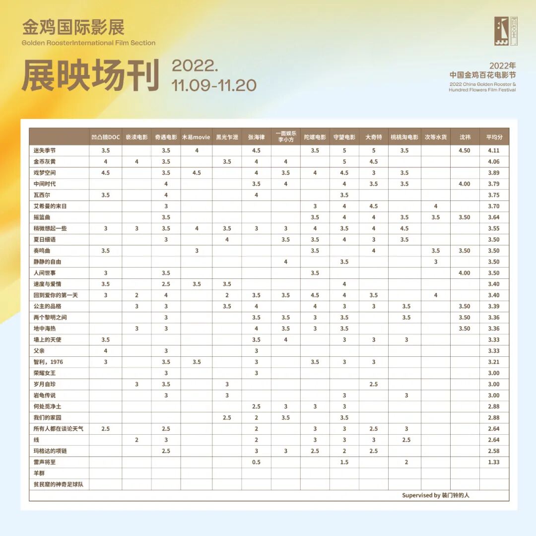 场刊为5分制,允许0.5偏差。经过十天的观影,2022金鸡国际影展场刊总榜结果出来。按照最终评分排序如下——以下是场刊团老师们最喜欢的5部电影,请查收。这些电影,大部分是中国首映,从金鸡国际影展之后,它们也将陆陆续续以各种形式与大家见面。请收好这份未来观影指南!Top 1