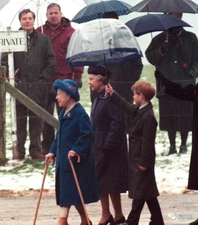 1995年3月,哈里和女王前去参加圣诞节活动,当时的女王陪着行动不便的母亲,在细雨中慢慢前行。