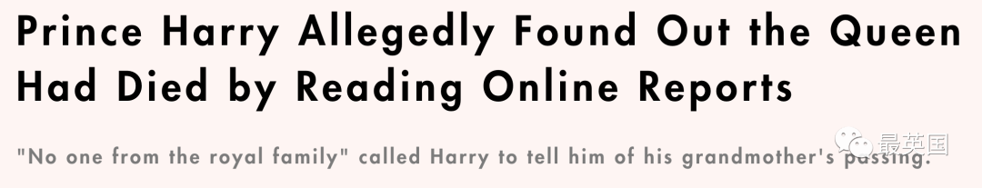 多个媒体的消息爆料称,当英国女王病危之际,哈里迫切想到奶奶身边看她最后一眼;但整个王室并没有人通知他伊丽莎白二世的去世,他竟然是在网上得知自己的亲奶奶去世了!