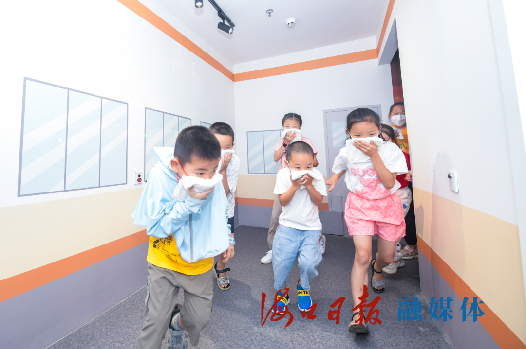 在龙华区文化馆青少年安全科普教育沉浸式体验空间内,小朋友们进行火灾逃生训练。