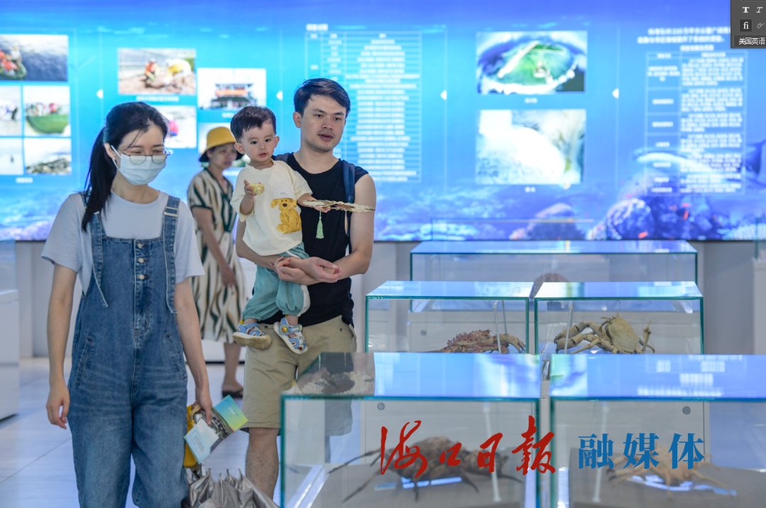 5月28日,在海口热带农业科技博览园,家长带着小朋友在热带生物资源科普馆内参观海洋生物标本。