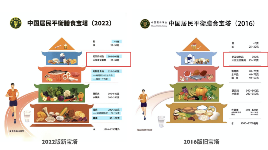 正因如此,最近刚刚发布的中国居民膳食宝塔(2022)也在原有2016版宝塔的基础上做了调整,从原先每天建议摄入奶制品300g,增加到300~500g。