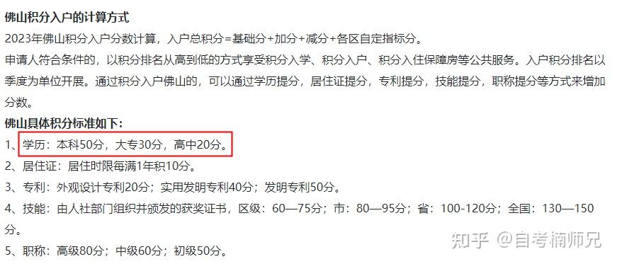 有些城市是实行积分入户制的,比如说佛山,积分入户的计算公式是这样的:总积分=基础分+加分+减分+各区自定指标分,本科学历可以加40分。