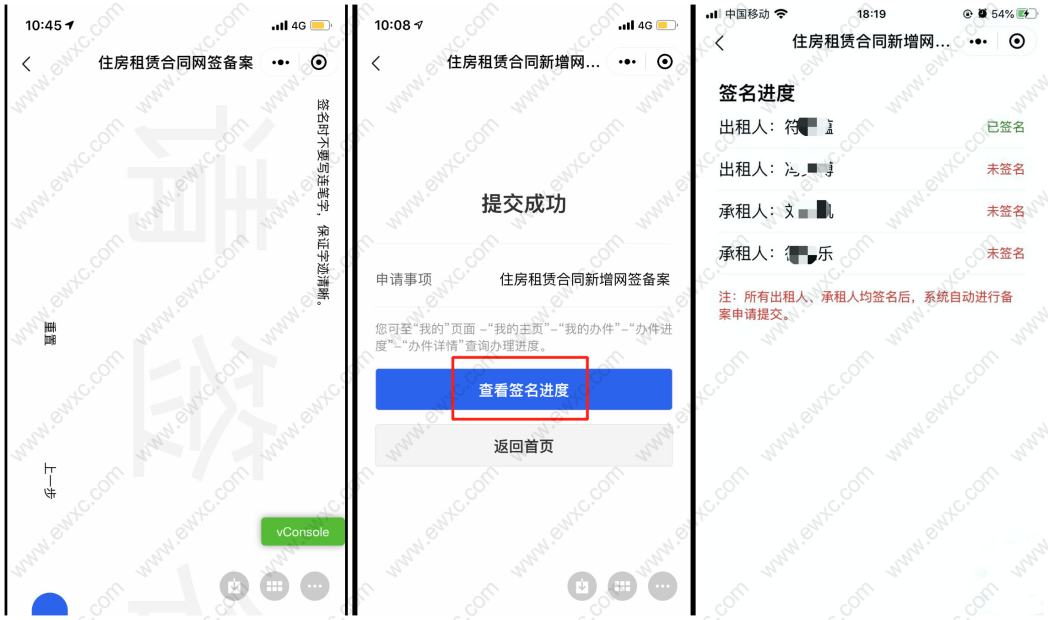 6. 确认无误后,由主申请人进行电子签名,签名成功后可查看签名进度列表,同时,系统将自动发送短信通知其他共同申请人。