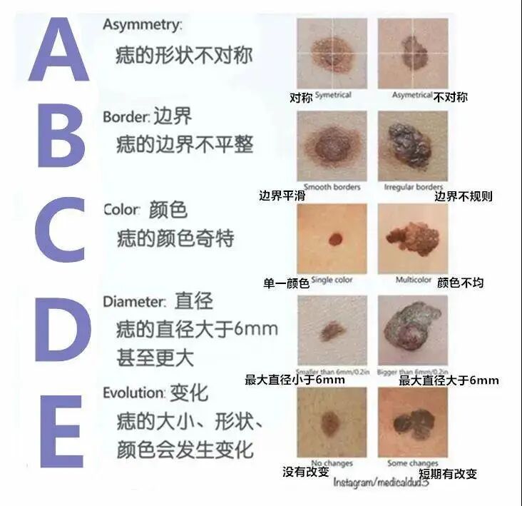 重要的事情说三遍,这不是笑话,而是血的教训。在临床上碰到太多黑色素瘤病人因为“点痣“延误病情、悔恨不已。对于存在恶变风险的“痣”建议完整皮肤切除,送病理检查,而非激光、冷冻,更不应该去“点”掉。皮肤基底细胞癌、鳞癌更不必说,手术是防止复发最重要方法。先天性巨痣、存在风险的交界痣也建议切除送病理。患者经常问到怎么判断”痣“有无风险,说白了就是靠原则、临床经验来判断,下面是诊断的ABCDE原则。