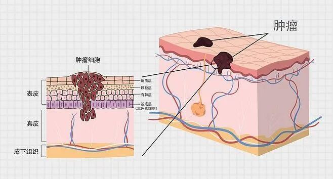 在欧美,皮肤黑色素瘤最常见,说到黑色素瘤的来由,必须先了解皮肤的结构,人体皮肤分为表皮和真皮,表皮分为:角质层、透明层、颗粒层、棘层、基底层。真皮层分为浅层和深层。