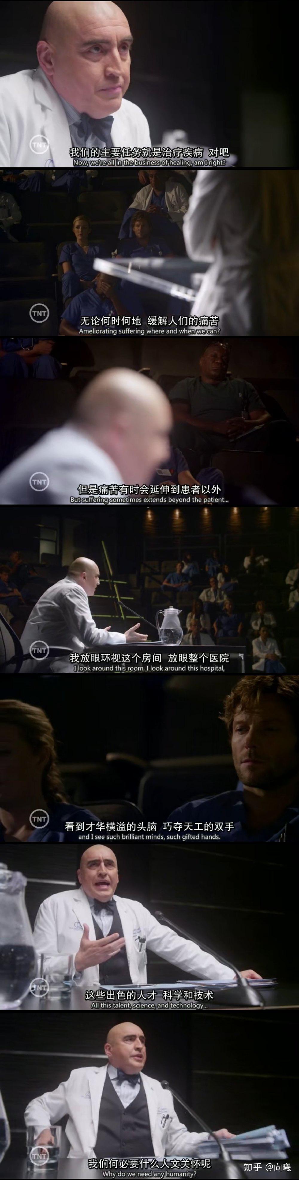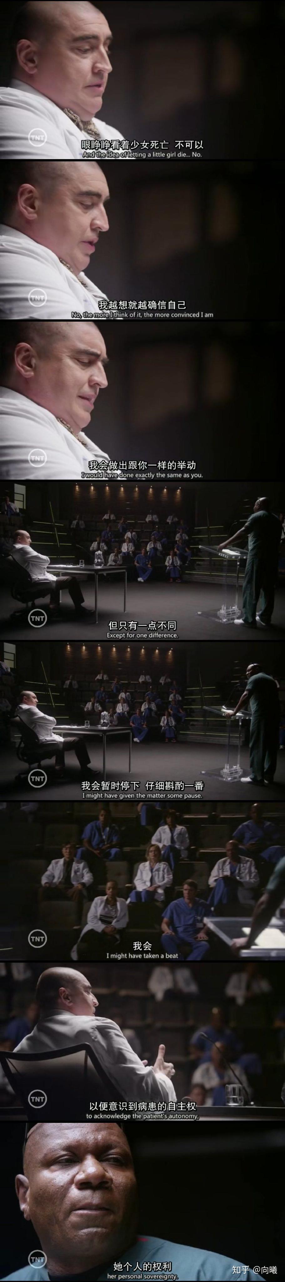 MM还谈到了其他很多伦理问题,比如说医疗事故处理,器官移植,宗教信仰,植物人等等。器官移植一方面谈到了受赠者的价值。医生认为患者有轻生念头,不值得接受移植。然后主任在311会议开始批斗了 下面有图,大概意思就是,医生没有权力决定他人的生命,也不能通过一个人努力与否来评判其价值。但是,这个之所以是一个伦理问题嘛,除了生命平等之外,确实还有对生命价值的讨论(就像临终关怀要考虑生命价值那样,器官移植就能完全不管不顾吗?)器官移植另一方面还谈到了捐赠者,最后一集,死者儿子不答应捐赠母亲器官,在法庭上,Buck说的,本来器官捐赠就是建立在人文关怀之上的,是帮助他人的行为,纵使真的有盈利,但也不能完全将它歪曲成利益,交易,而更应该从一个博爱的角度去看待。比如,谁谁正在焦急的等待某个器官延续生命,捐赠就是对他人的帮助,是理应感到快乐的。但是,器官移植是否应该具有法律强制效应,还是应该听从患者或其家属的意愿,很难找到两全其美的答案...