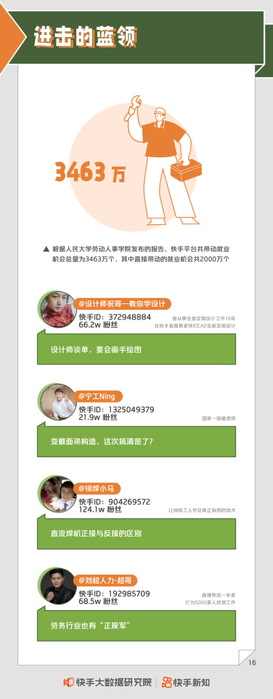 蓝领群体同样在快手尤为活跃。据中国人民大学劳动人事学院发布的报告,快手平台共带动就业机会总量为3463万个,其中直接带动的就业机会共2000万个。@刘超人力-超哥,在快手有着67万粉丝,直播带岗一年多,已为5000多人成功找到工作。有着123.6万粉丝的@铆焊小马,让铆焊公认学会真正有用的技术,提升人们的职业技能。
