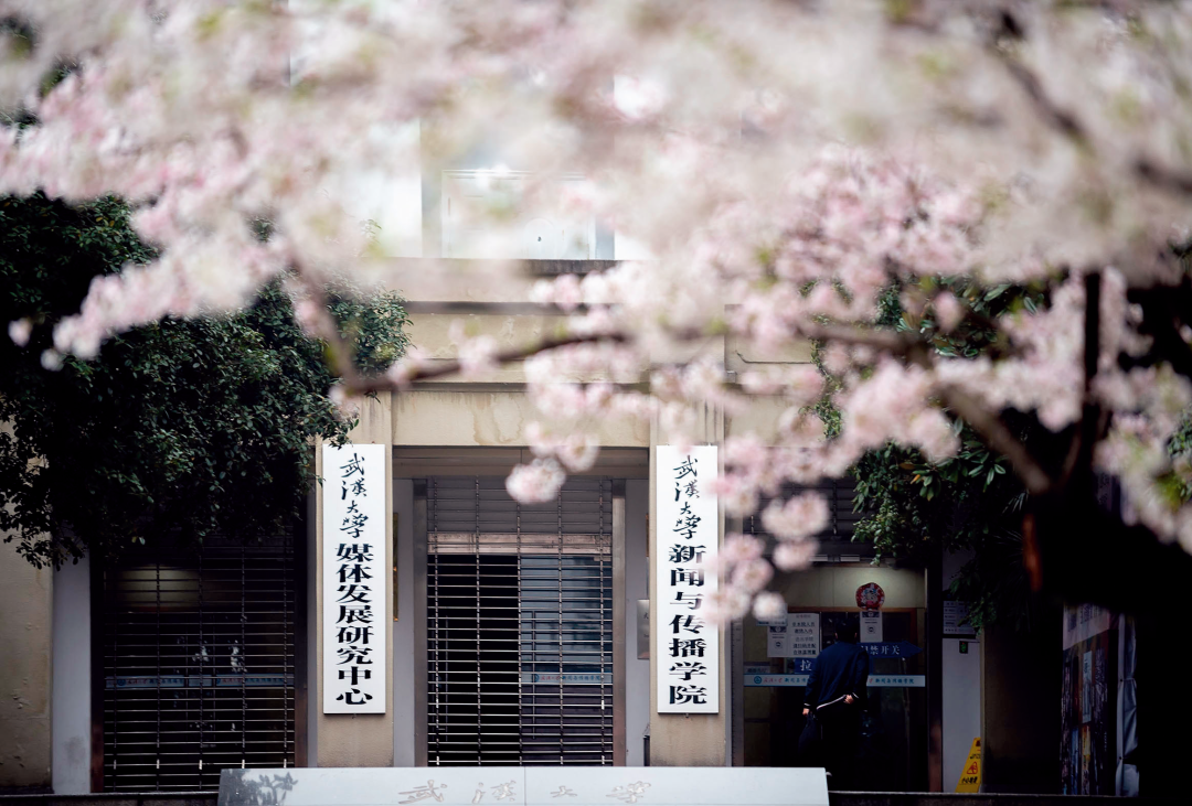 春日烂漫时,沿着樱花大道走至花团锦簇的尽头,满目映入浓郁绿意之余,“武汉大学新闻与传播学院”在喧嚣斑斓中显得格外沉稳。