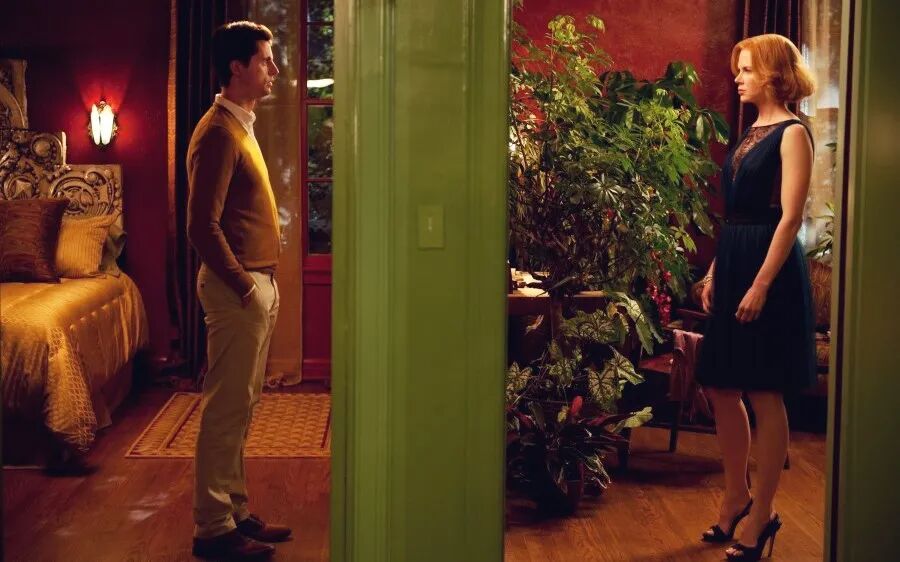 和洪尚秀大道至简的转场不同,朴赞郁的转场之花哨,再华丽的文字也没法描述,朴赞郁热衷用大量的撞色,尤以红绿最常见:“复仇三部曲”、《蝙蝠》和《斯托克》,无一不是大块红与绿的较量,再辅以黑灰这类中性色,《机器人之恋》则是蓝黄配。