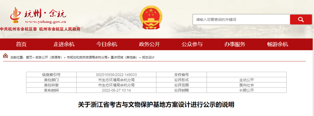 6月27日,浙江省杭州市余杭区委区政府官网公示了浙江省考古与文化保护基地方案设计及相关内容,这意味着浙江省考古与文物保护基地建设已经正式提上议程。