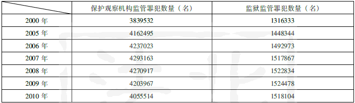 表4 2000-2010年保护观察机构与监狱监管罪犯数量