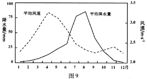 材料二 下图8为“十大孔兑地区地形和流域示意图”,图9为“十大孔兑地区月平均降水量和风速图”。