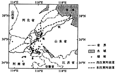 堌堆是黄河下游地区的古代先民在平原上修筑的土堆台地遗址,主要用于居住。先秦到汉朝均有较多的堌堆,汉朝以后的数量极少。图1示意黄河下游地区堌堆的空间分布。据此完成下面小题。