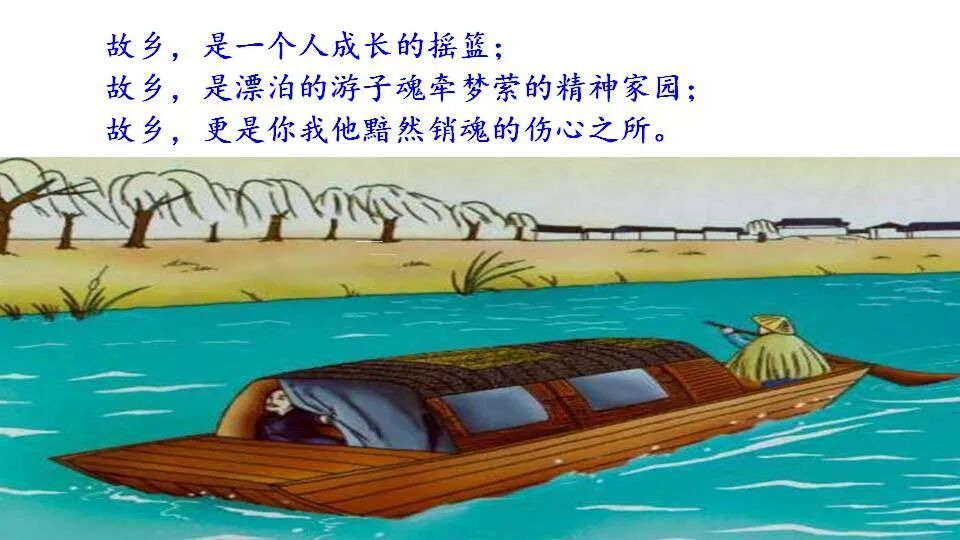 “我们的船向前走,两岸的青山在黄昏中,都装成了深黛颜色,连着退向船后梢去。”该句描写坐船离开故乡时的景象;苍茫暮色、深黛色的青山,营造出苍凉的氛围;既表现出“我”对故乡的无限依恋,又烘托了“我”悲伤、惆怅的心境。