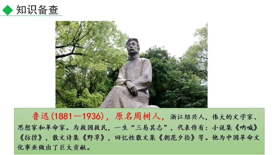 鲁迅(1881一1936),原名周树人,字豫才,浙江绍兴人,著名文学家、思想家、民主战士,五四新文化运动的重要参与者,中国现代文学的奠基人。“鲁迅”是他在1918年发表《狂人日记》时所用的笔名,也是影响最为广泛的笔名。其代表作有小说集《呐喊》《彷徨》《故事新编》,散文集《朝花夕拾》,散文诗集《野草》和杂文集《坟》《热风》《且介亭杂文》等。