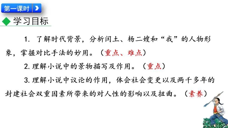 明确:其实这也是一种对比手法,小说以杨二嫂的自私、尖刻、贪婪、势利来对比、衬托闰土的淳朴诚实,从更广泛的意义上展示人与人关系的隔膜,深入揭露封建社会传统观念对他们的精神毒害,造成人们纯真的人性被扭曲。作者塑造这两个人物形象,真切地抒发了对现实社会的不满,表达了希望有新的生活的炽热感情。