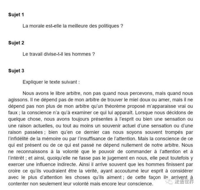 哲学是法国高中生的必修课,也是高考的第一道关卡。考试第一门考的是哲学,考试时间8:00-12:00,4个小时写一篇作文。题目如下,三选一,你看看会不会做。