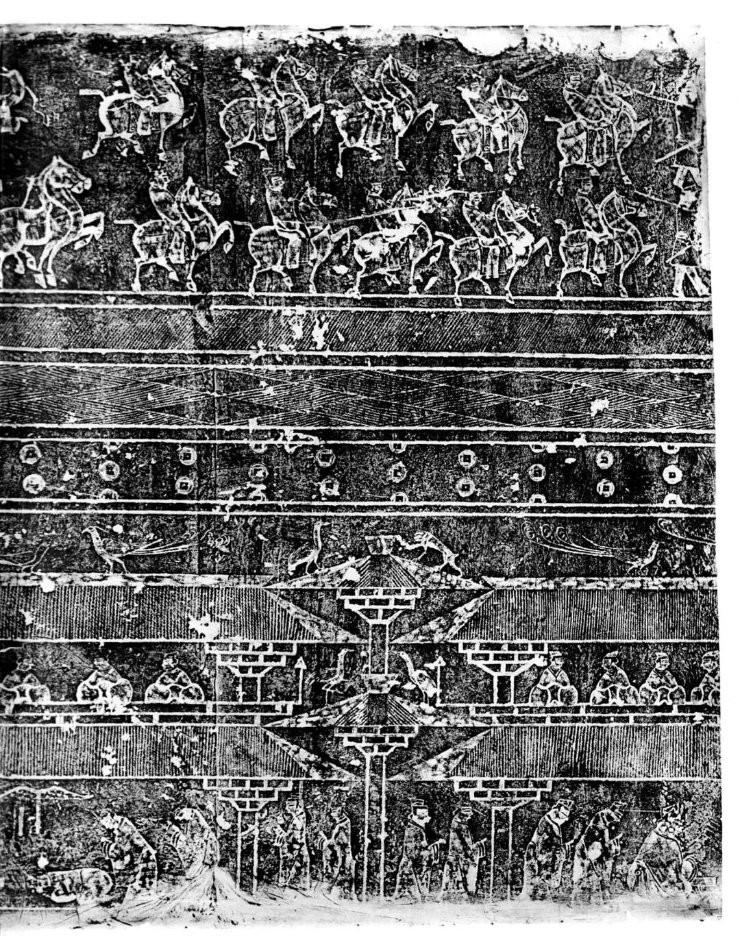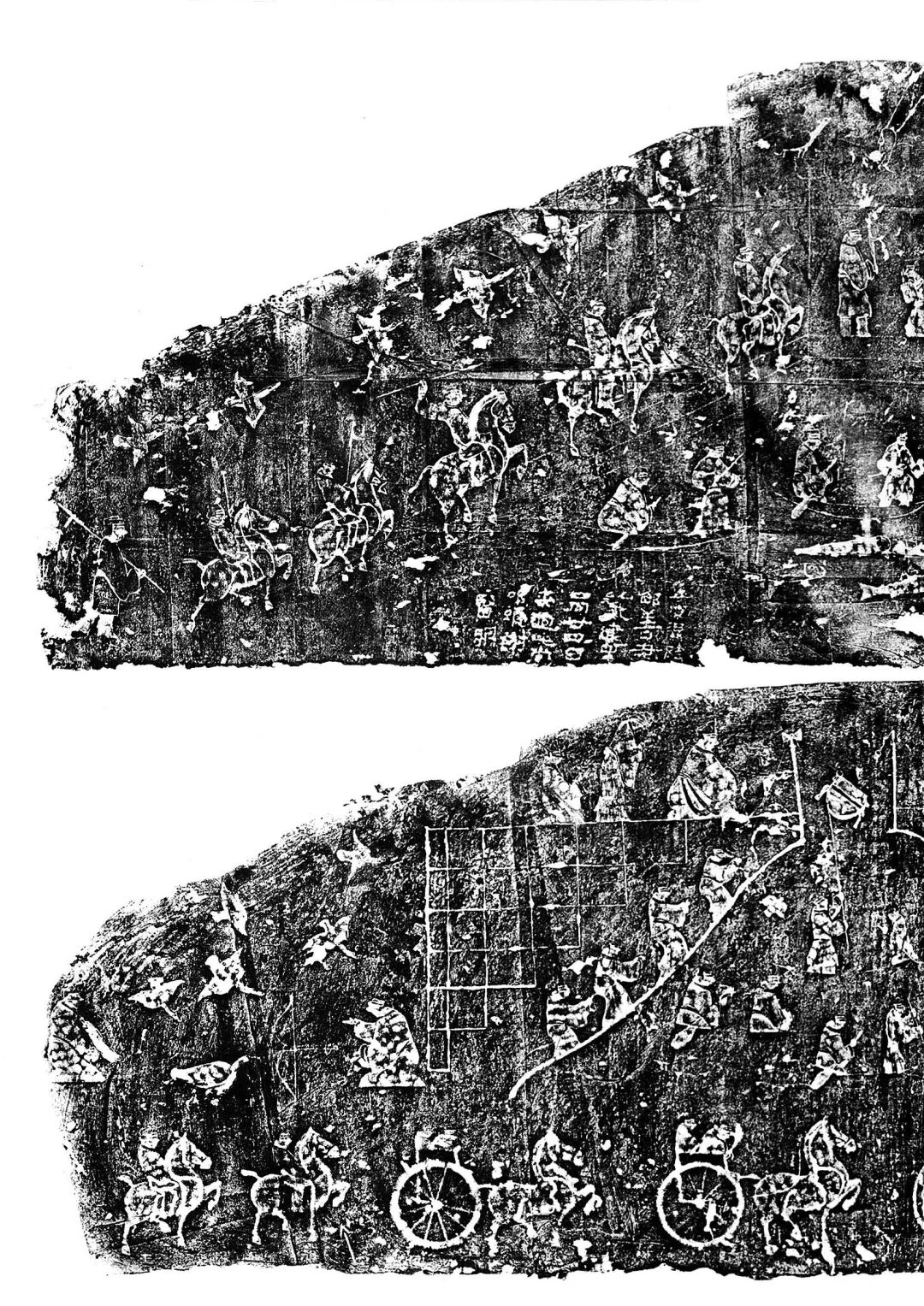 3.表现社会生活的画像大多都是一些模式。车骑出行、楼阁人物、庖厨宴饮、乐舞百戏、胡汉战争、狩猎农事等,是我们常见的题材。这不仅反映了当时普遍流行的作风,也反映了这一作风长期延续下来的情况。在车骑出行图中往往刻有题榜,与墓主人的生前活动和身份有关。如孝堂山郭氏石祠出行图中刻的“大王车”“二千石”题榜。武荣祠中刻的“此君车马”“君为都邮时”“主簿”“五官椽车”“君为市椽时”,都和墓主人有着直接的关系。嘉祥五老洼画像石第三石(其实是石祠后壁)上的人物旁,刻有“故太守”题榜,指的也是墓主人的身份。
