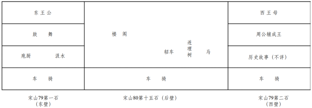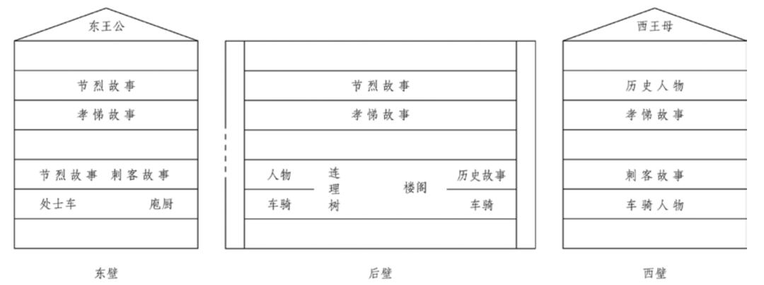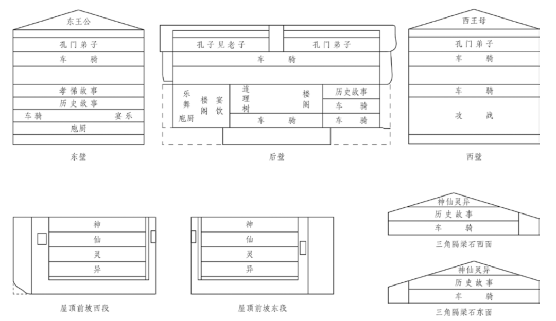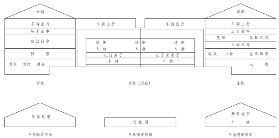 三角隔梁:两面画像皆分三层。上层:神仙灵异。中层:历史故事。下层:车骑。