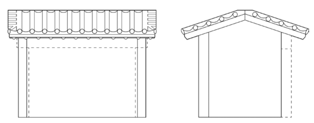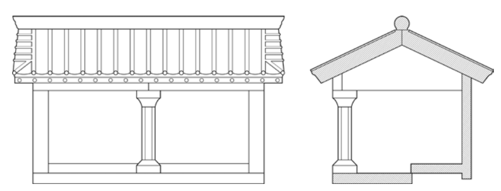 B型Ⅰ式石祠:为双开间悬山顶两面坡式的大石祠。中间置三角隔梁,使石祠呈双开间的形式。其余部分与A型Ⅰ式石祠相同。可以孝堂山郭氏石祠、徐州洪楼发现的汉画石像(石祠)为代表【图10】。
