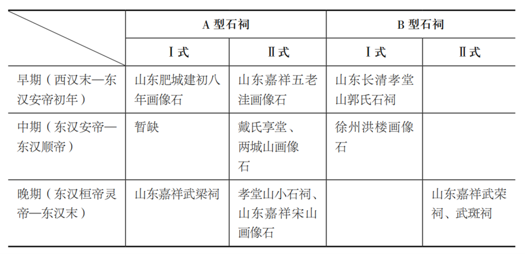 为了使各种石祠的发展线索看起来方便、明了,我们把从西汉末到东汉末这段时间分成早、中、晚三期,列制简表如下: